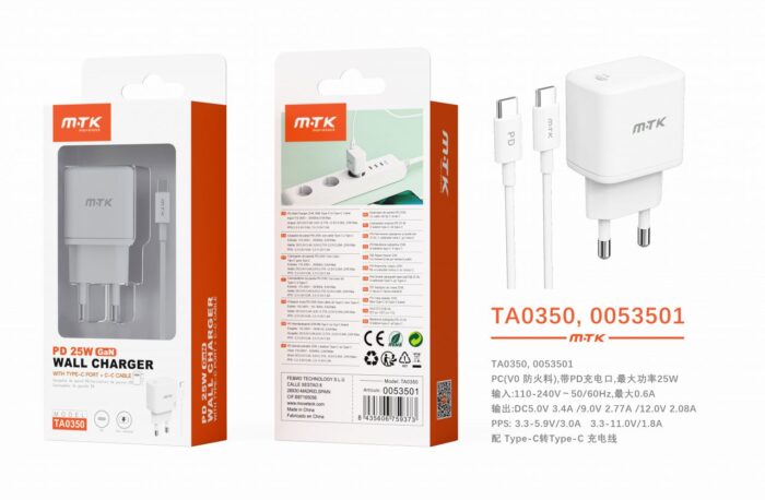 TA0350 BL Cargador de Red Rapida Taylor , 1 puerto Type-C (PD), con Cable Type-C a Type-C , 25W/3.4A(Max), Blanco