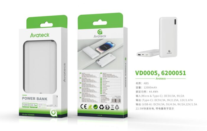 VD0005 BL PowerBank 12000mAh/44.4Wh con indicador de bateria soporta Carga Rapida 22.5w, 2 entrada USB+Type-C, 2 salida USB+Type-C, Blanco