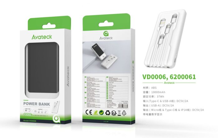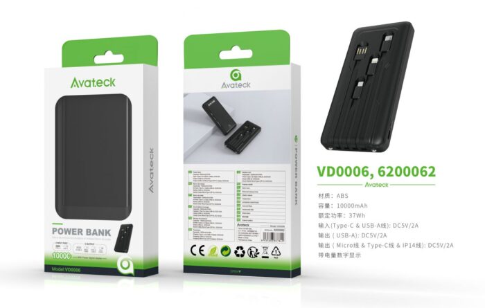 VD0006 NE PowerBank con indicador bateria 10000mAh/37Wh, 2 entradaUSB+Type-C, 5 salida USB+Micro USB+Lightning+Type-C, Negro