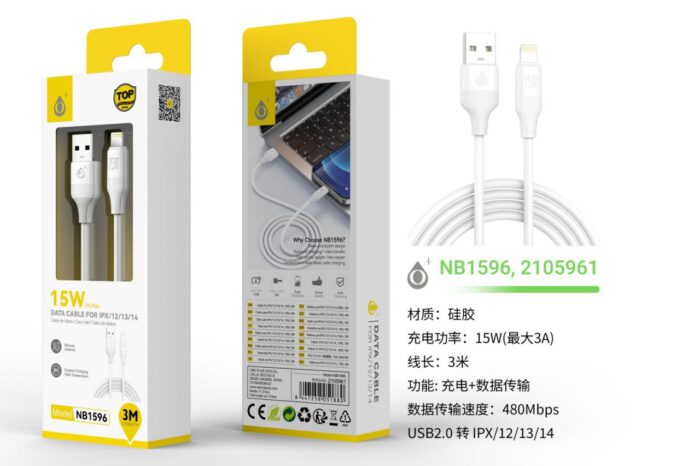 NB1596 BL 15W/3A Cable de datos Filero de silicona para Iphone 5-14, 3M, Blanco