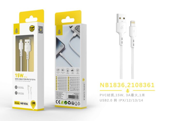 NB1836 BL 15W/3A Cable de datos fonti para Iphone 5-14, 1M, Blanco