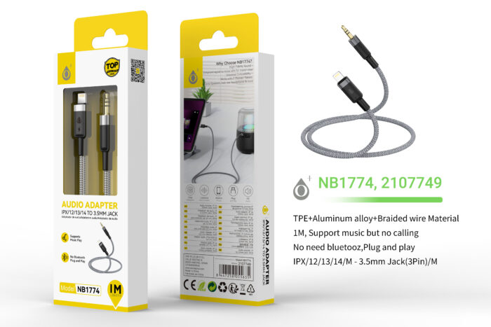 NB1774 GR Cable de audio aluminio trenzado Iphone a Audio 3.5mm, Plug and Play, 1m, Gris