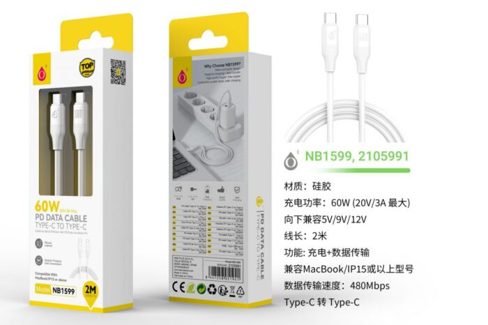 NB1601 BL Cable de Datos Filero de silicona, Type-C a Type-C, Carga rapida PD 60W/20V/3A, Cable 3M , Blanco