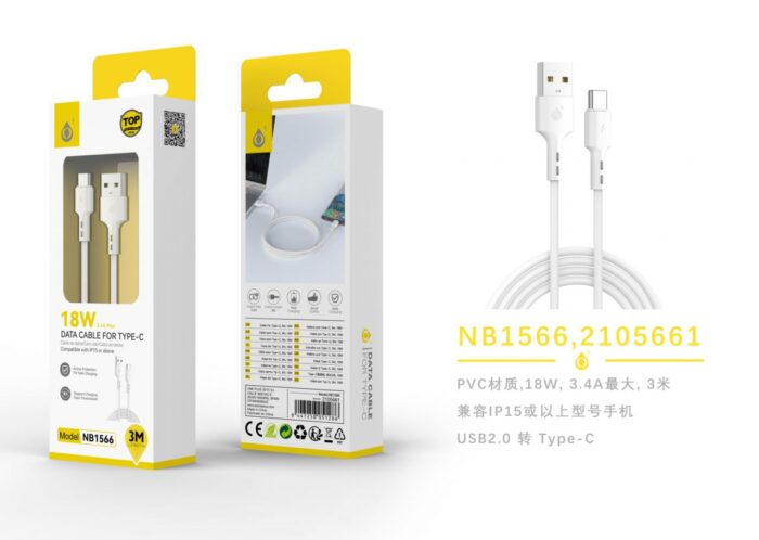 NB1566 BL 18W/3.4A Cable de datos fonti para Type-C, 3M, Blanco