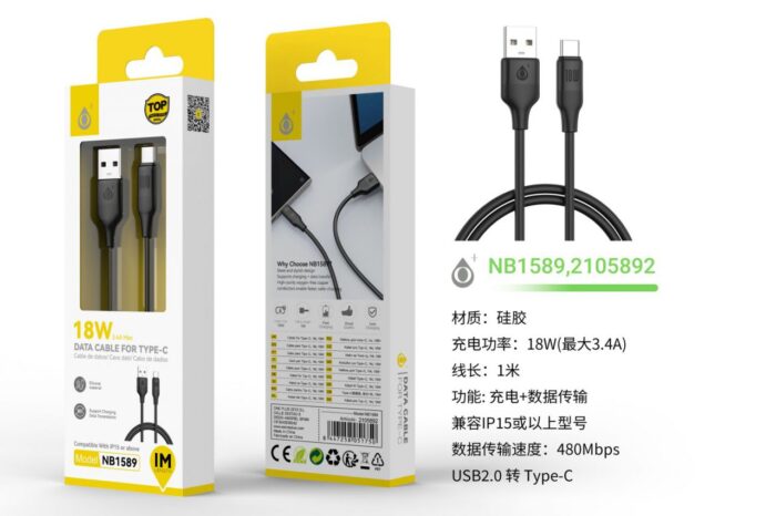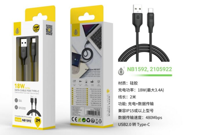 NB1592 NE 18W/3.4A Cable de datos Filero de silicona para Type-C, 2M, Negro