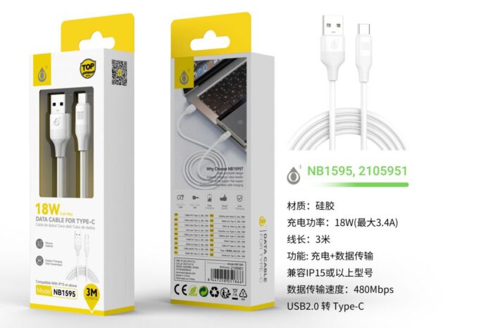 NB1595 BL 18W/3.4A Cable de datos Filero de silicona para Type-C, 3M, Blanco