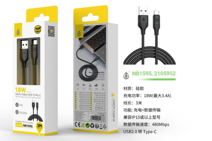 NB1595 NE 18W/3.4A Cable de datos Filero de silicona para Type-C, 3M, Negro