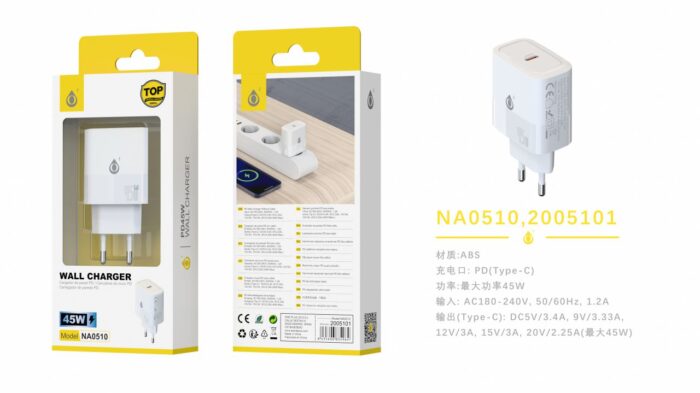 NA0510 NE Cargador Rapido de Red lua, 1 puerto Type-C, Sin Cable, 45W/3.4A, Negro
