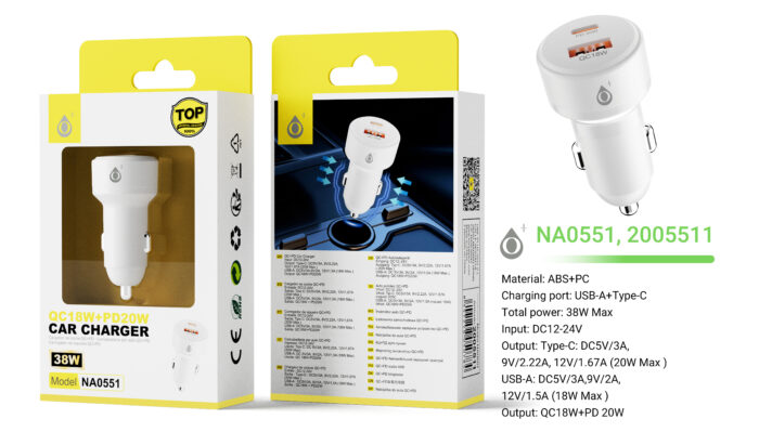 NA0551 BL Cargador Rapido de Coche Fili sin cable, con 1 USB-A+Type-C QC3.0+PD, 38W, Blanco