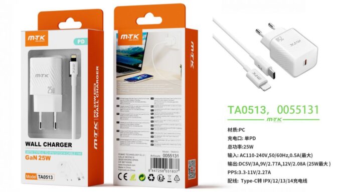 TA0513 BL Cargador GaN de Red Rapida Mon con funda protector, 1 puerto Type-C PD, Con cable Type-C a Iphone 25W/3A(Max), Blanco
