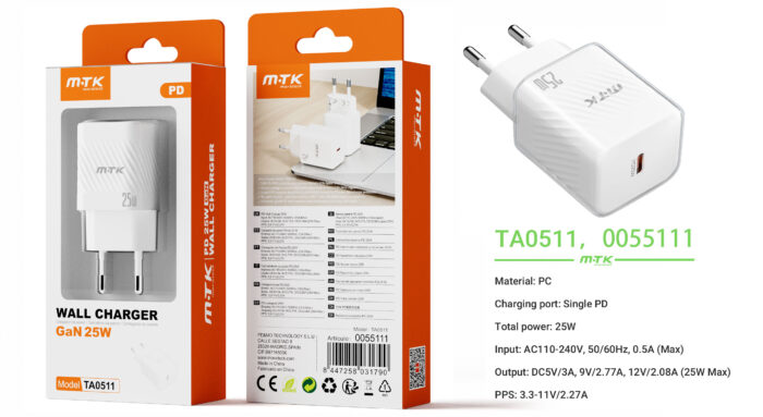TA0511 BL Cargador GaN de Red Rapida Mon con funda protector, 1 puerto Type-C PD, Sin Cable 25W/3A(Max), Blanco
