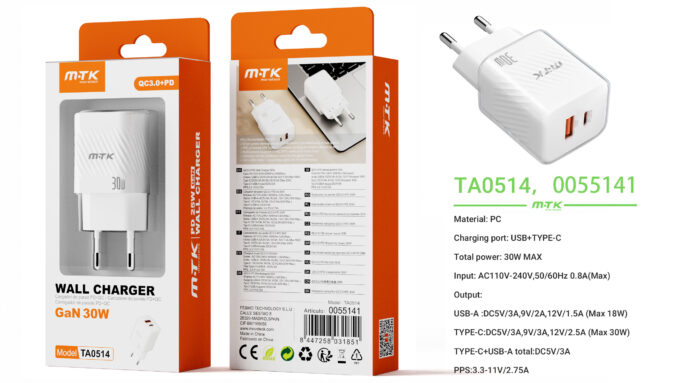 TA0514 BL Cargador GaN de Red Rapida Mon con funda protector, 1 puerto Type-C PD, Sin Cable 30W/3A(Max), Blanco