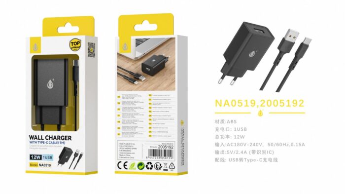 NA0519 NE Cargador de Red lua 1 USB Con Smart Chip, Con Type-C, 12W/2.4A, Negro