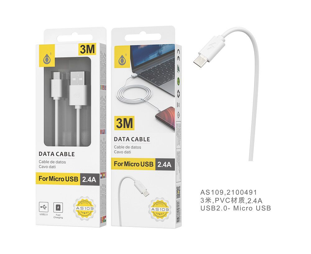 23102091 AS109 BL Cable de datos para Micro USB 2.4A, 3M Blanco