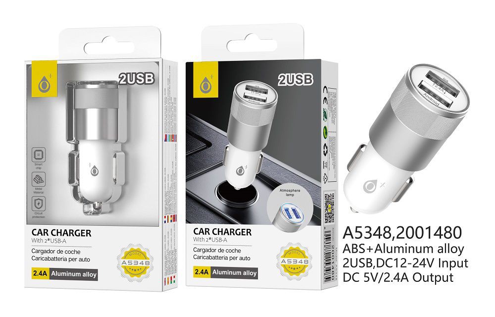 A5348 BL+PL Cargador  Mechero Versus sin cable , 2USB,2.4A/5V, Blanco + Plata