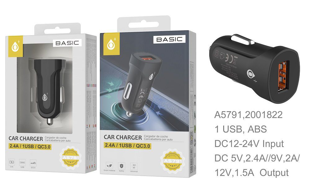 A5791 NE Cargador de Mechero Rapido S. Basic QC3.0 Amaltea sin cable , 1USB Inteligente, 2.4A Max, Negro