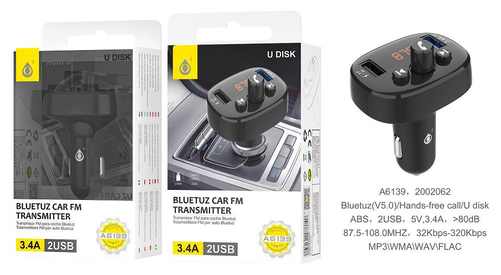 A6139 NE Transmisor Bluetooth Believe  para coche , 2 USB con 3,4A Max, Controlador de llamada y Volumen, FM/USB, Negro