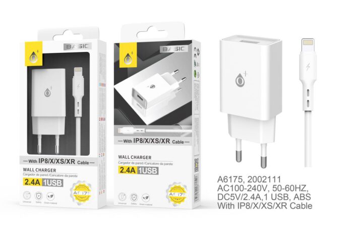• TA0309 NE Cargador de Pared Milky, con cable IP 5-13, Chip de Reconocimiento Inteligente 2USB, 2.4A, Negro