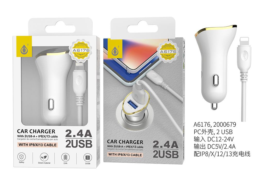 A6176 BL+OR Cargador Mechero Yoga con Cable para Iphone 5/6/7, 2USB 2,4A, Blanco y Oro