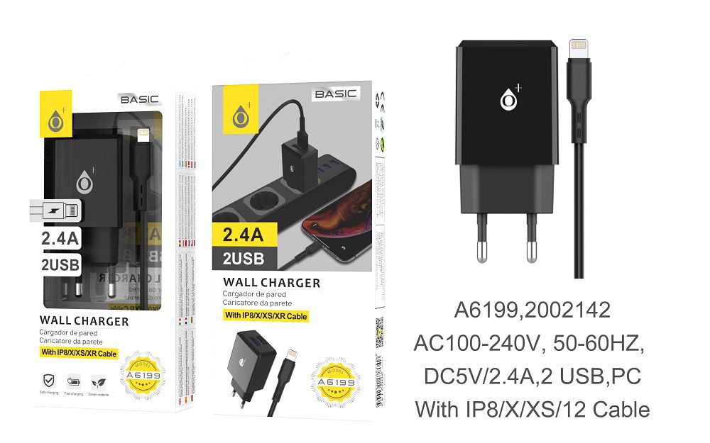A6199 NE Cargador de Red S.Basic Tebe 2 USB con Cable IP5/6/7/8/X, 2 USB , 2.4A,Negro