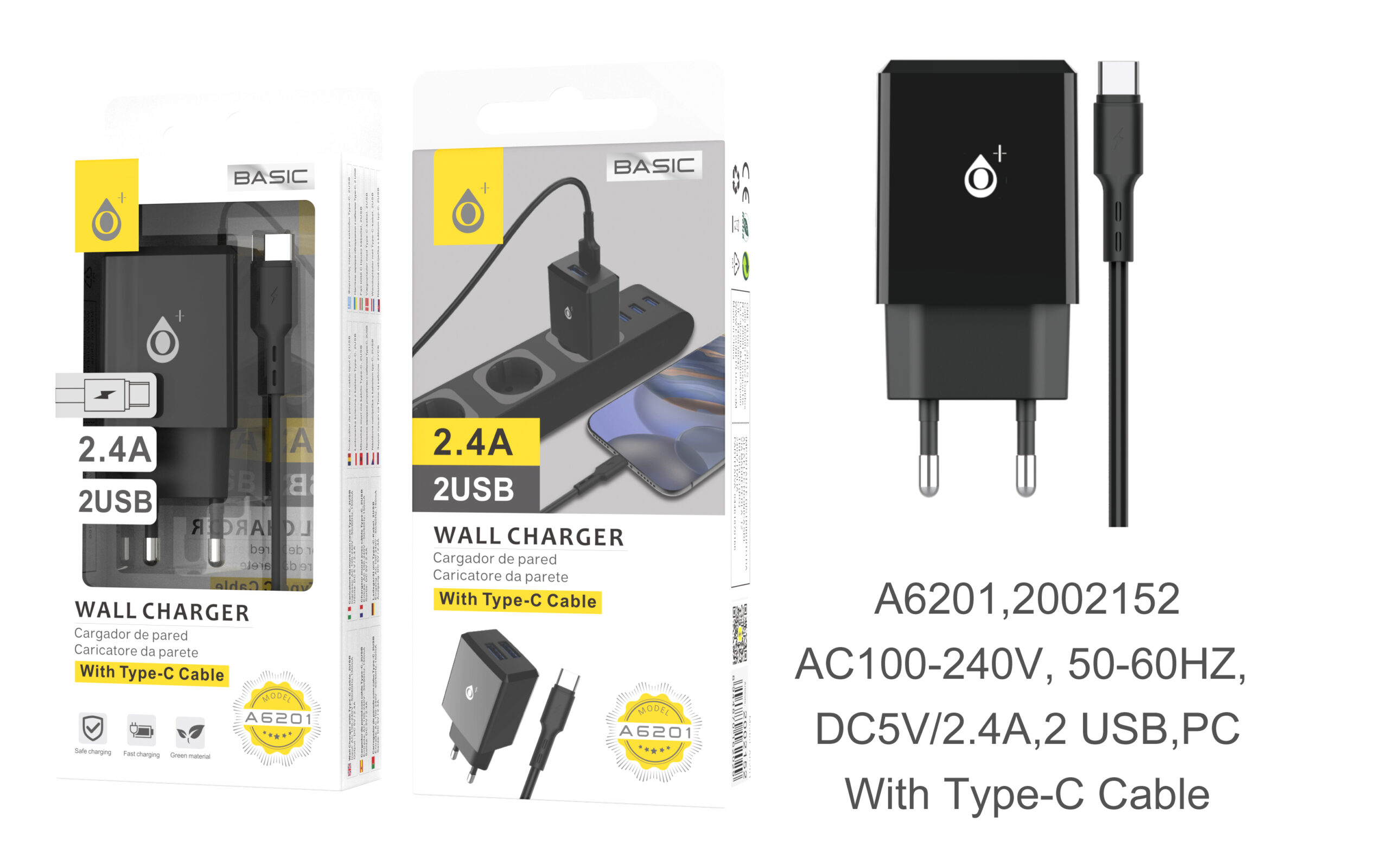A6201 NE Cargador de Red S.Basic Tebe 2 USB con Cable Type C, 2 USB , 2.4A,Negro
