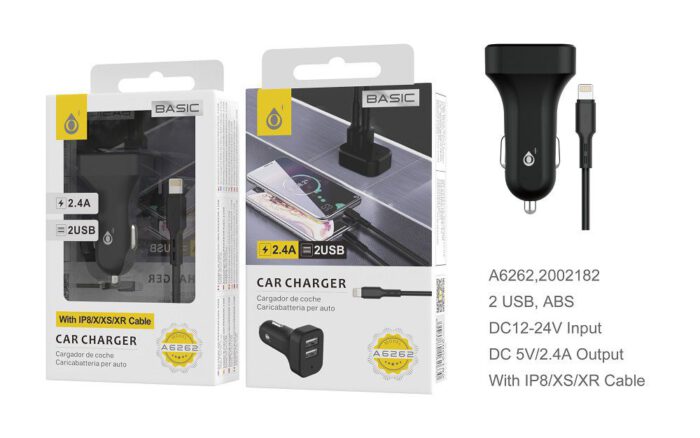 A6262 NE Cargador de Mechero S.Basic Epime con cable IP6/7/8/XS/XR, 2USB, 2.4A , Negro