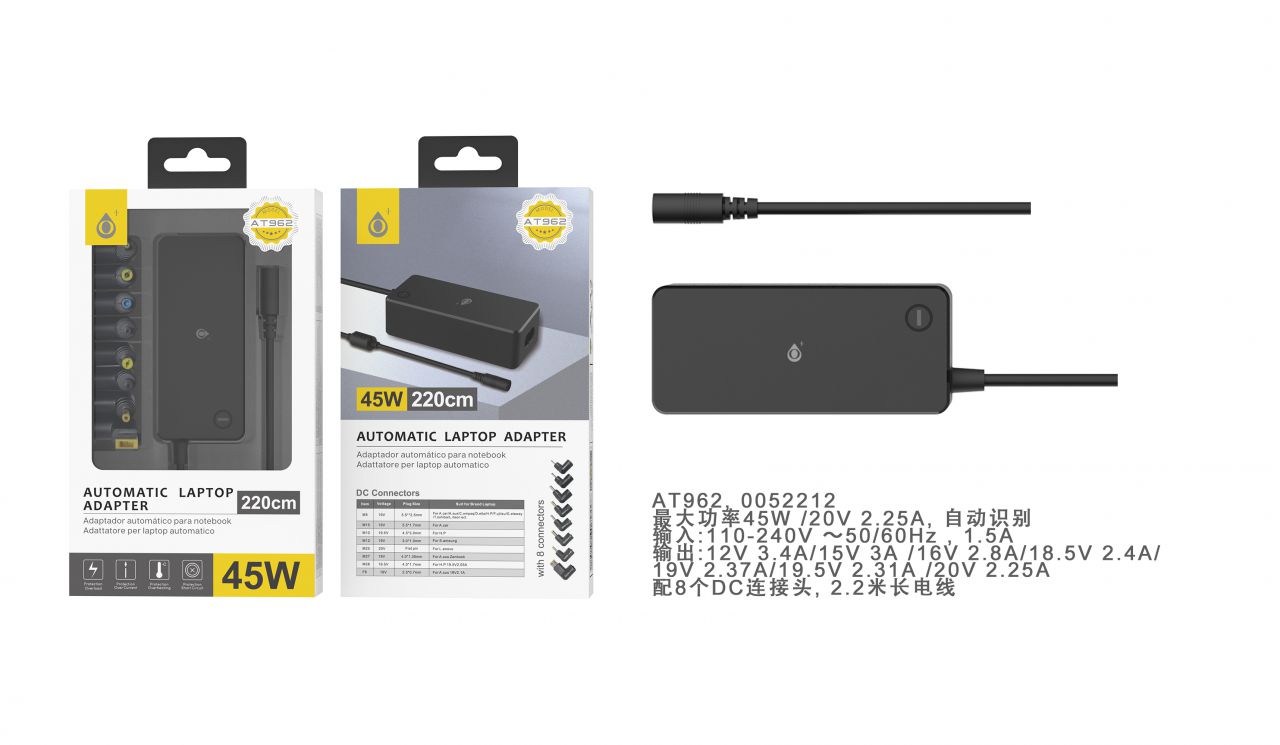 AT962 NE Cargador Universal Automatico con 11 Conectores para Portatiles , 45W, 3.25A Max, Cable 1.2M, Negro