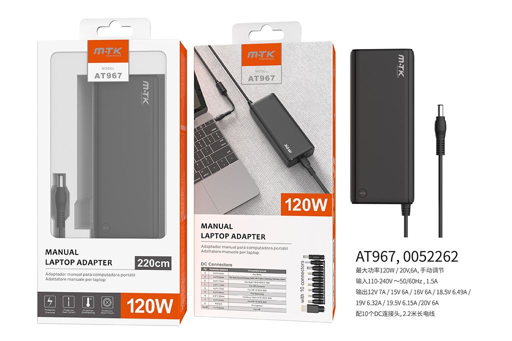 AT967 NE Cargador Universal Manual con 10 Conectores para Portatiles , 120W, 7A Max, Cable 1.2M, Negro