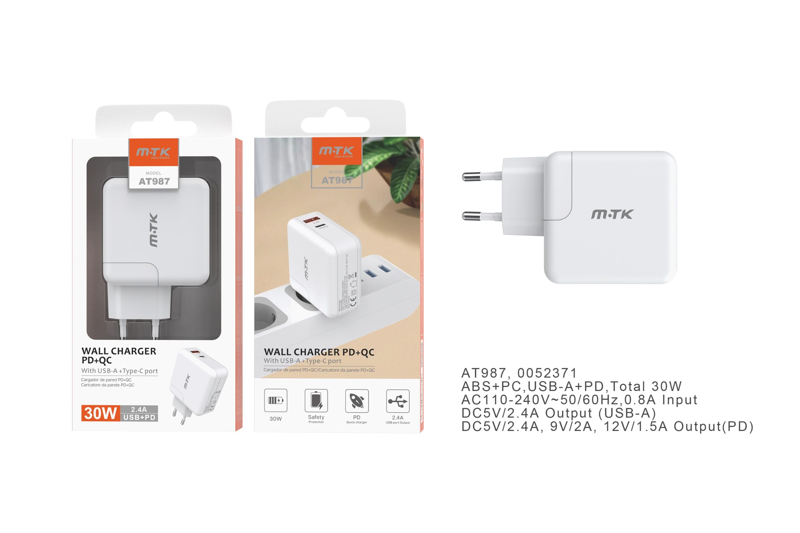 AT987 BL Cargador de Red Rapida Alta Calidad M.TK Premium Eliria sin cable , 1USB(2.4A),1 PD3.0 18W, Blanco