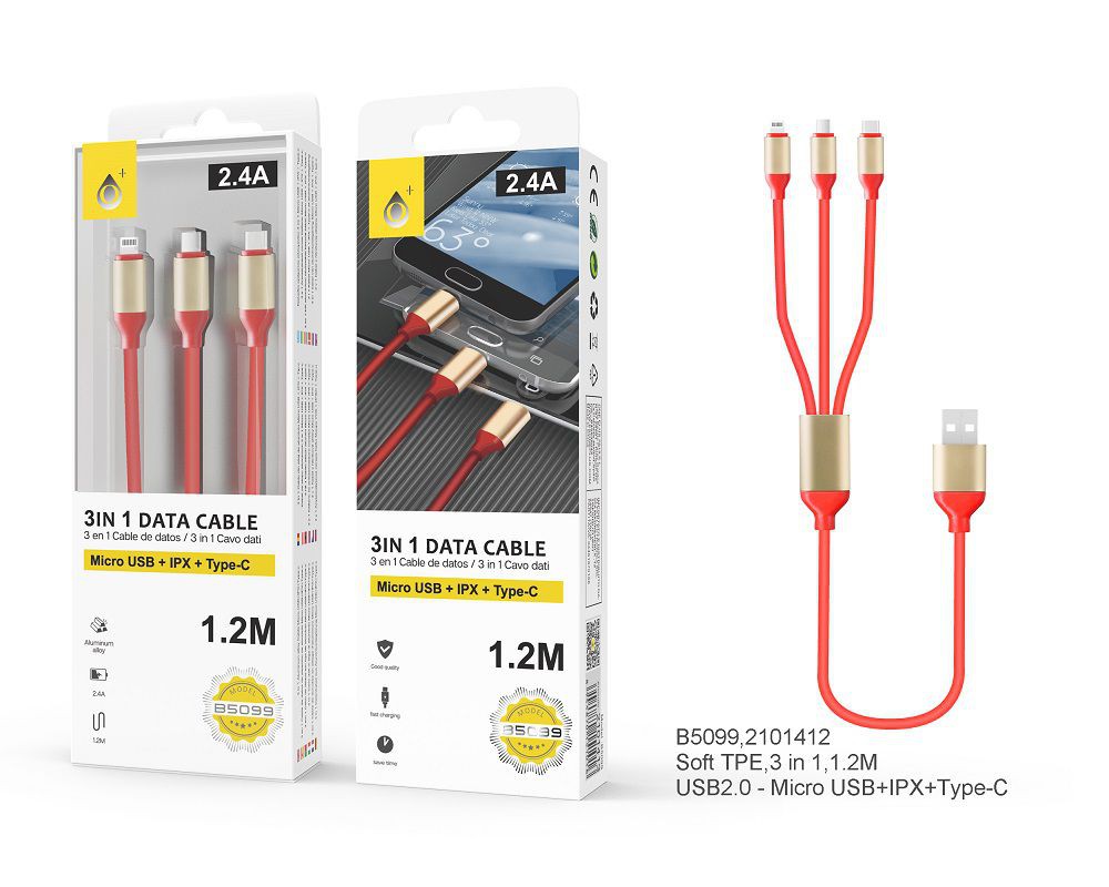 B5099 RJ Cable de carga 3 en 1(Micro Usb, Iphone, Type C),2A, 1.2M , Rojo