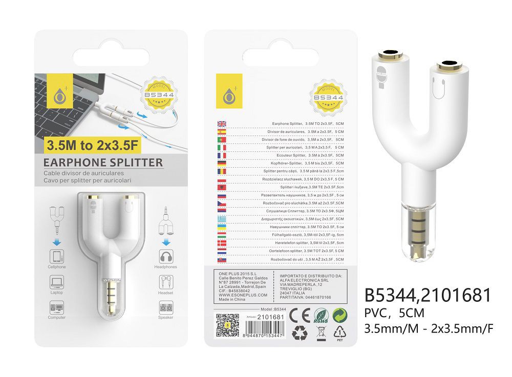 B5344 BL Adaptador Audio 1 jack 3.5mm a 2 jack hembra(microfono+auricular),Blanco