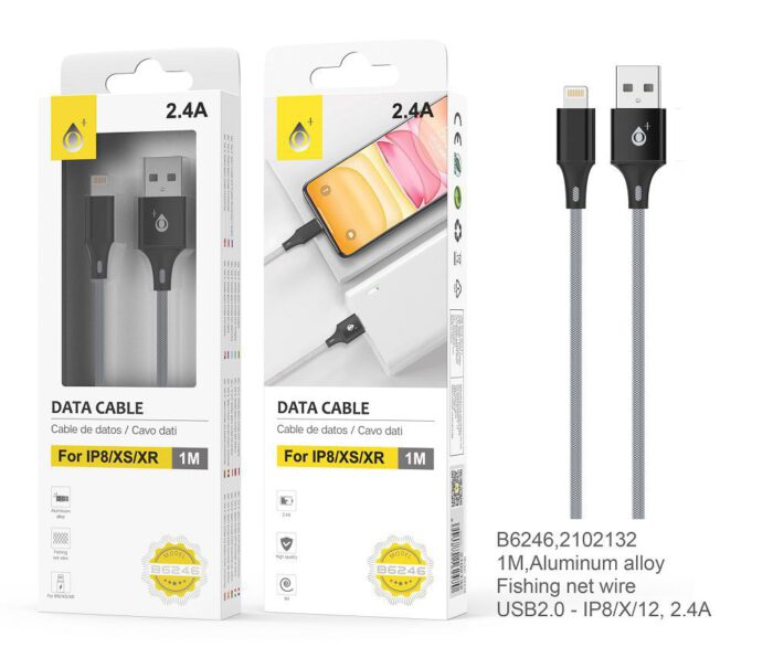 B6246 NE Cable de datos Aluminio Kratos para Iphone 6/7/8/X/XR/11, 2.4A , 1M, Negro