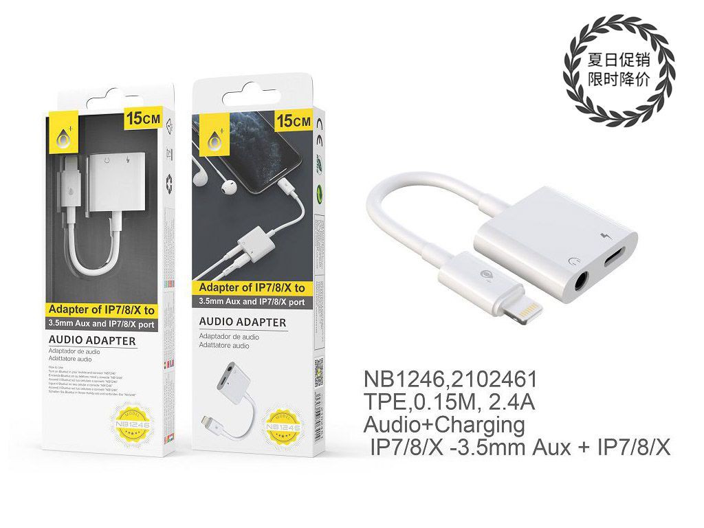 BL NB1246 Cable Adaptador 2 En 1 IP a Carga Iphone + Audio 3,5mm , 0,15M, Blanco