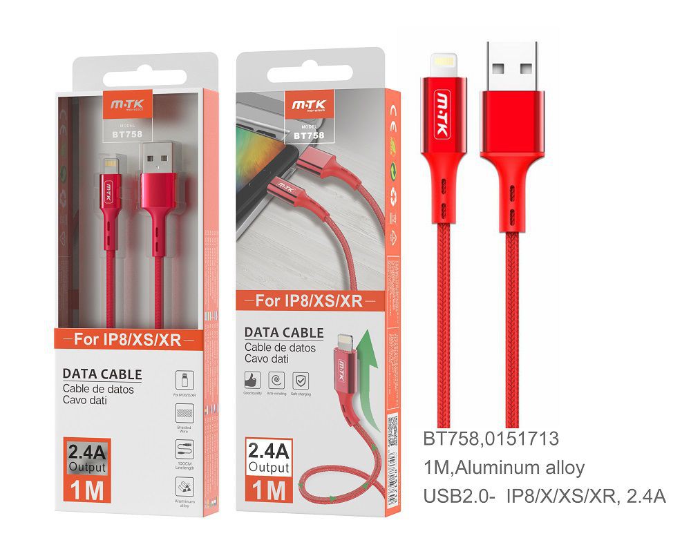 BT758 RJ Cable de Datos Aluminio Flat para IP 5/6/7/8X , 2A 1M , Rojo