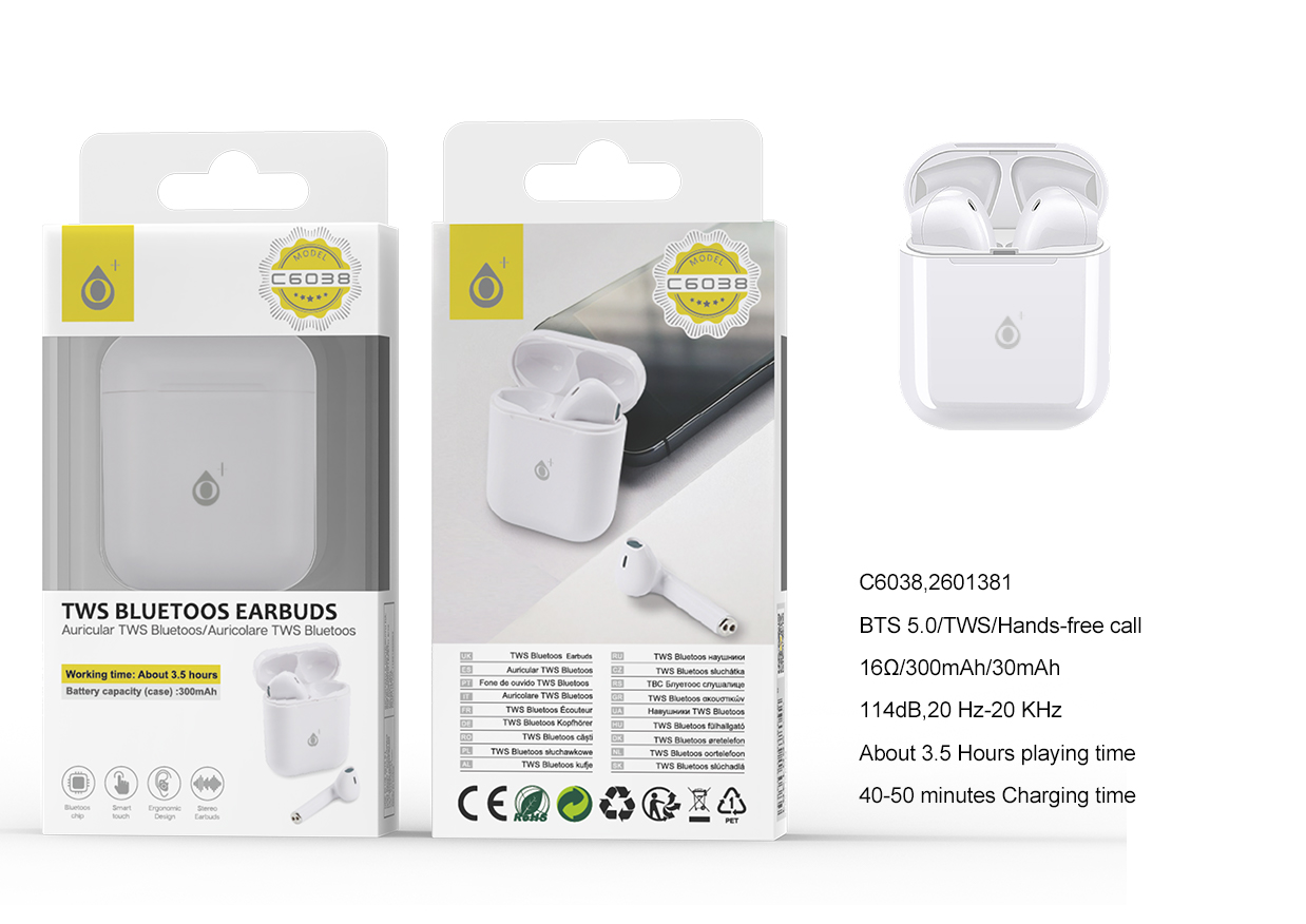 C6038 BL Auriculares Bluetooth TWS Larix (40mAh*2) con estuche cargable(300mAh), Blanco