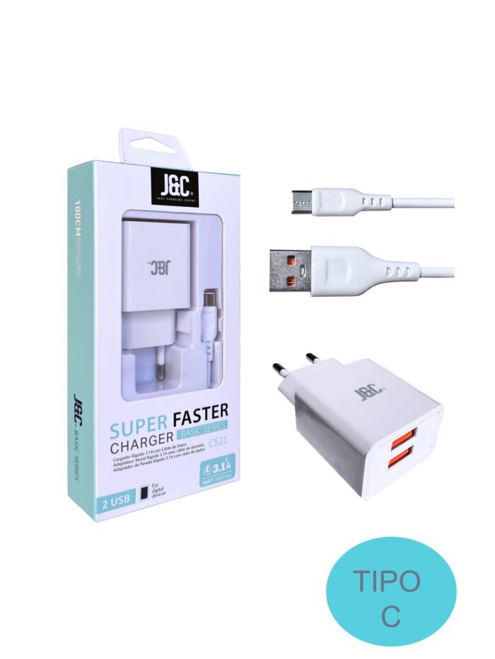 Cargador Tipo C Carga Rápida2 USB 3,1A Cable Tipo C  J&C C521 TIPO C Blanco
