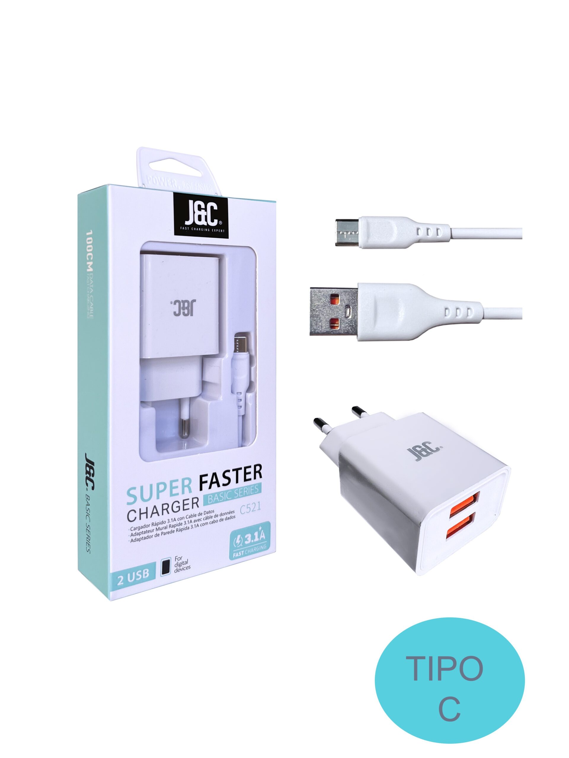 Cargador Tipo C Carga Rápida2 USB 3,1A Cable Tipo C J&C C521 TIPO C Blanco
