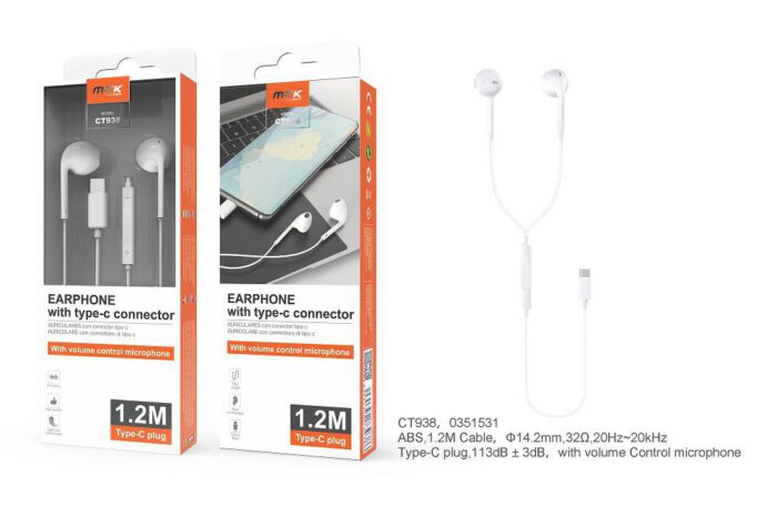 CT938 BL Auriculares dinamicos 3D ANTURIO con Microfono  de cable Type C, 1.2M,Blanco