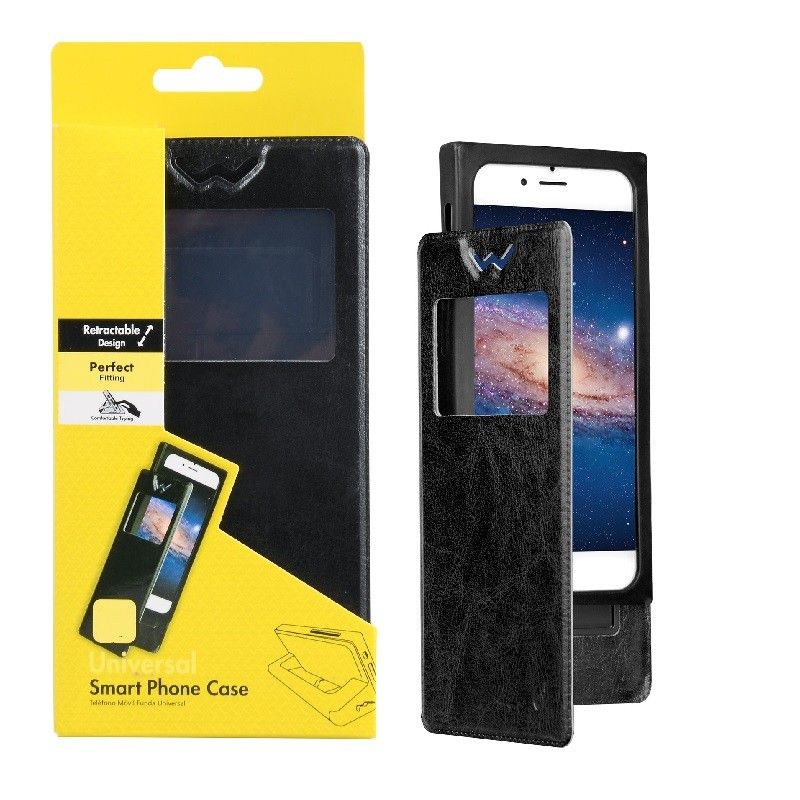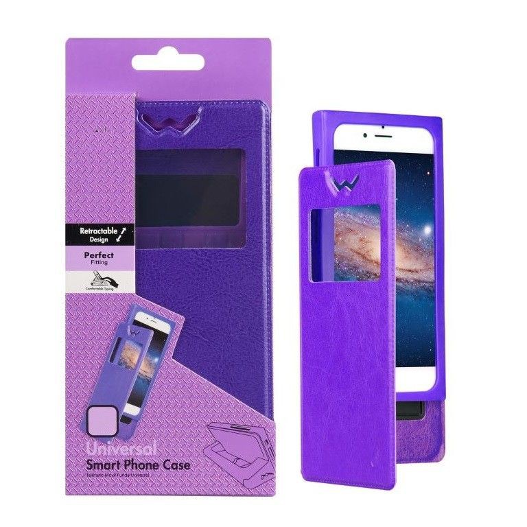 Funda Universal tipo libro con ventana e imán.  Funda estilo lisa , protege la parte anterior y posterior del teléfono. Apertura lateral y cierre con imán.