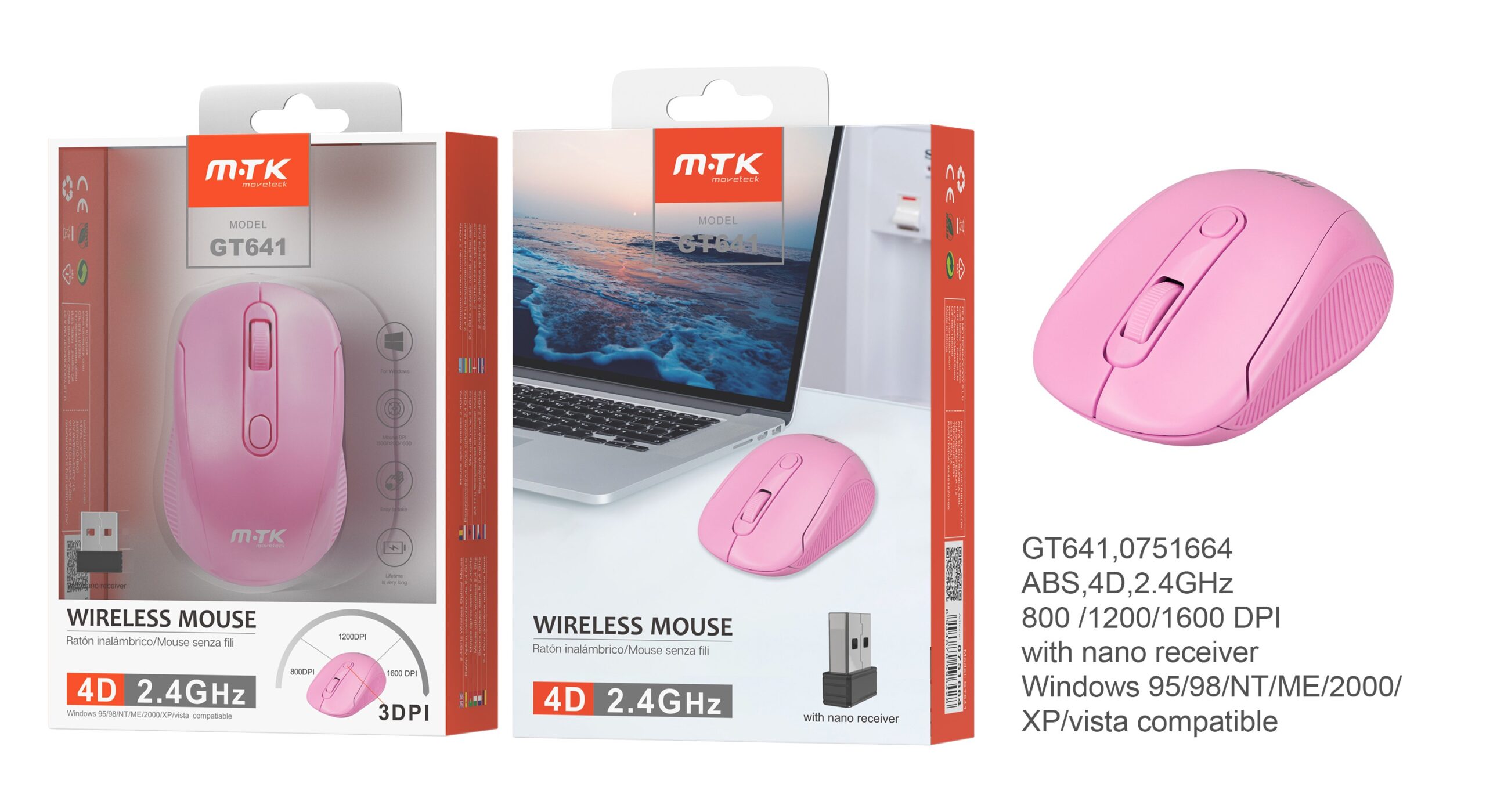 GT641 RS Ratón Óptico Inalámbrico Krack 2.4GHZ 800/1200/1600 DPI,Rosa