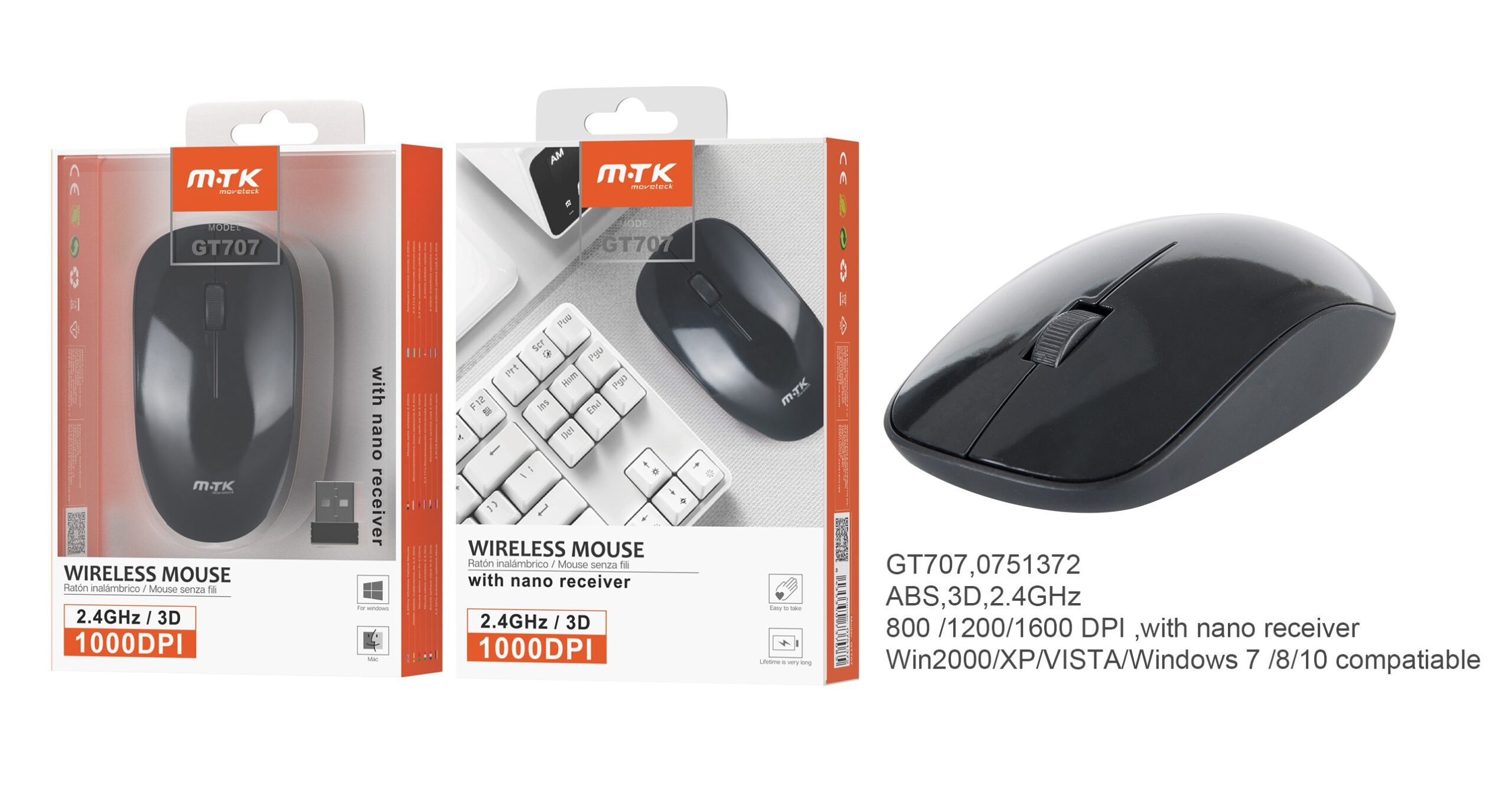 GT707 NE Ratón Inalámbrico Marte 2,4GHZ, 800/1200/1600 DPI, Negro