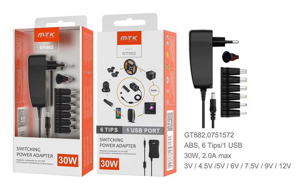 GT882 NE Cargador Universal BM 24W con 1USB 6W, 3V-12V 2A con 6 tips