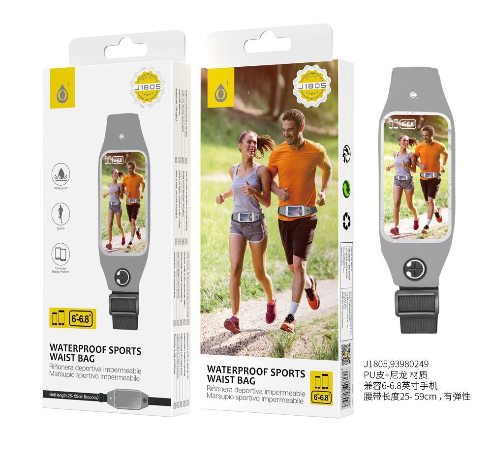 J1805 GR Bolsa de Cintura Deportiva Impermeable para moviles, 6 - 6.8 Pulgadas, Gris