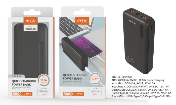 • TD2126 NE PowerBank Hazel 20000mAh/74Wh, Carga Rapida 22.5w, 2entrada(Micro USB+Type-C), 3salida(Type-C+2USB), Negro