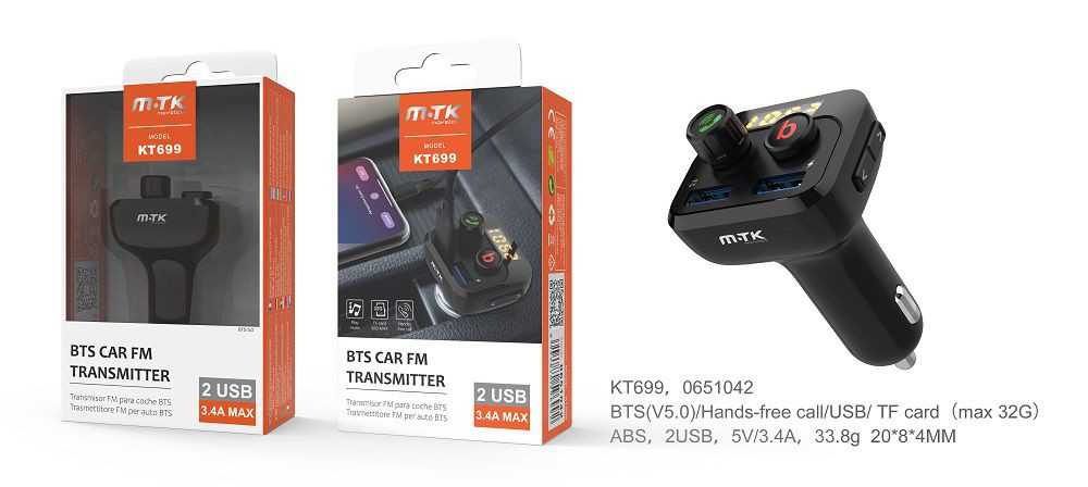 KT699 NE Transmisor Bluetooth de FM con Microfono y Pantalla LED,3.4A con 2USB para cargar, con boton EQ BASS, FM/USB/TF,Negro