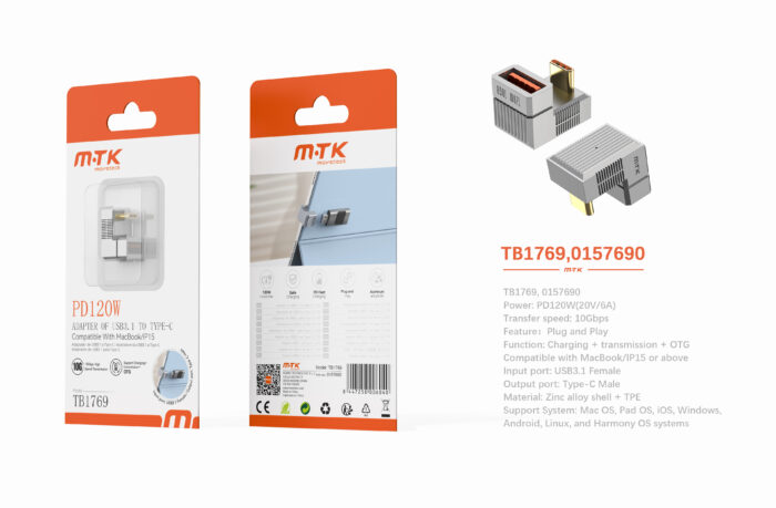 Luxury TB1769 GR Adaptador OTG en U USB 3.1 hembra a Type-C Macho. PD 120W/20V/6A/10Gbps. Compatible Apple Type-C. Gris