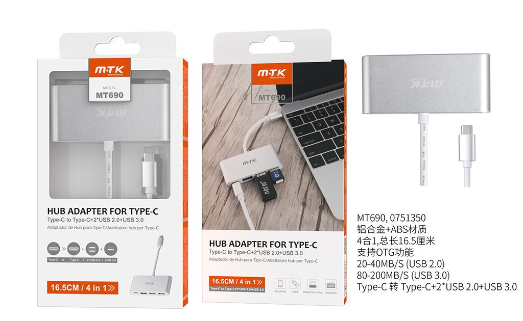 MT690 Cable Adaptador Type C para 4 Puertos de Type C, USB2,0 x2  y USB 3,0