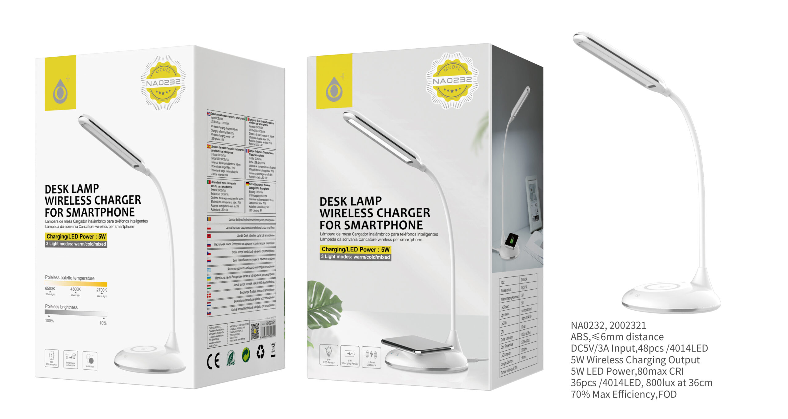 NA0232 BL Lámpara de mesa Ledia LED 5W con Cargador Inalámbrico para móviles 5W, Color (blanco o amarillo) y Brillo de Luz ajustable, Blanco