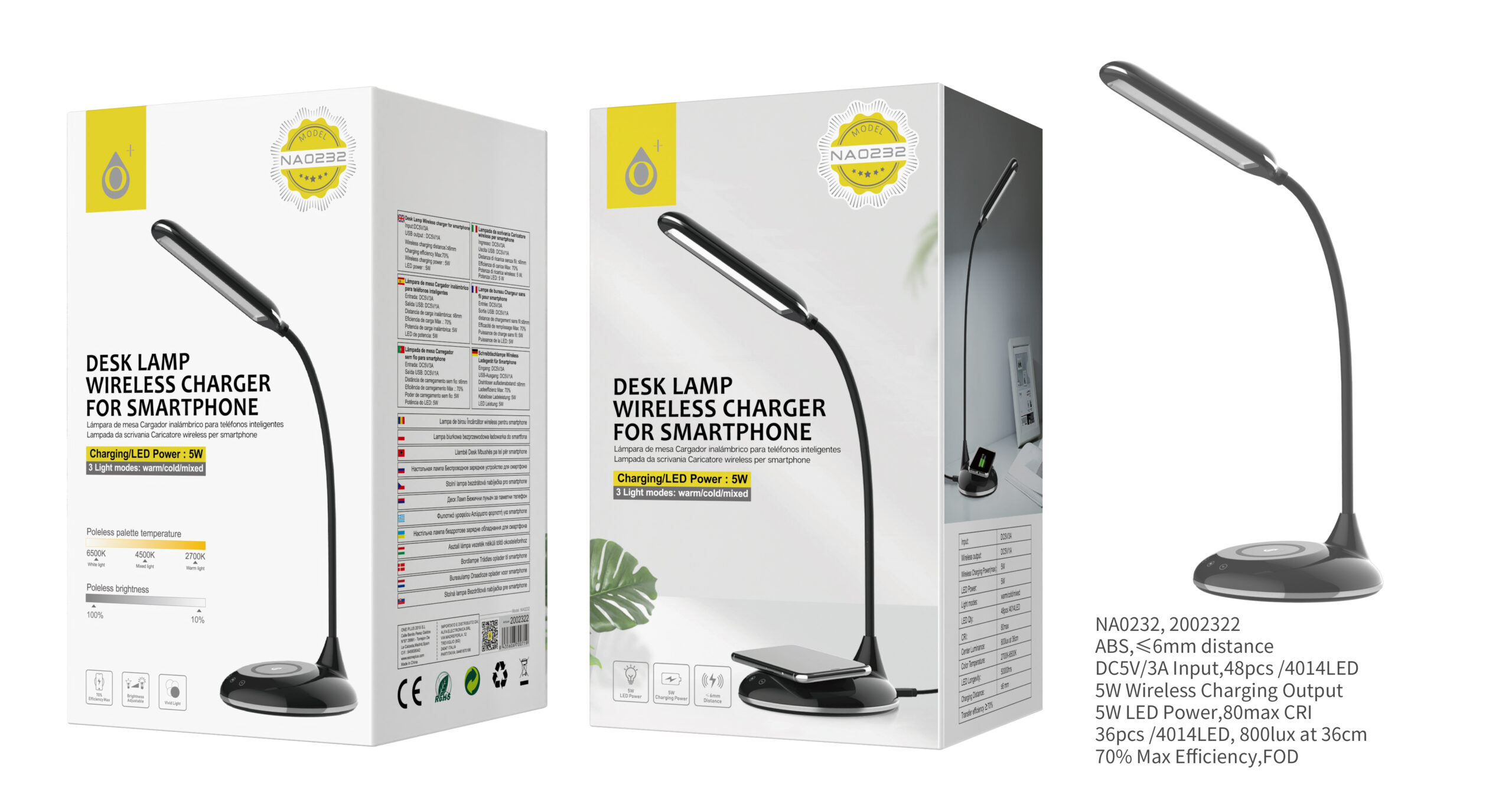 NA0232 NE L醡para de mesa Ledia LED 5W con Cargador inalambrico para Moviles 5W, Color (blanco o amarillo) y Brillo de Luz ajustable, Negro