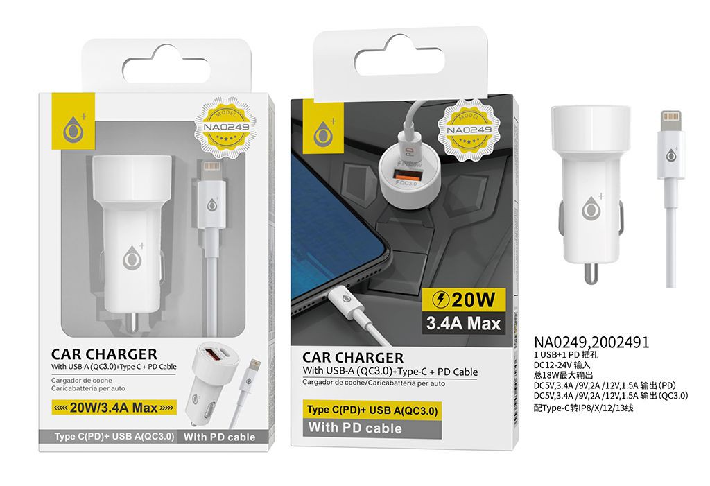 NA0249 BL Cargador de Coche Pivot con Cable Type-C a IP 5-12, con puerta Type-C (PD)+ USB-A, 18W, 3.